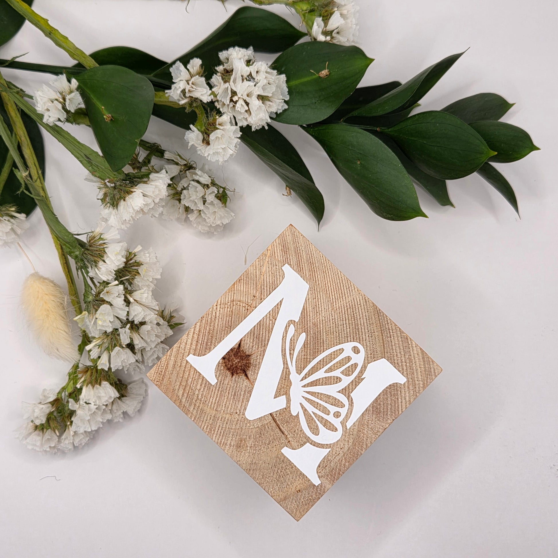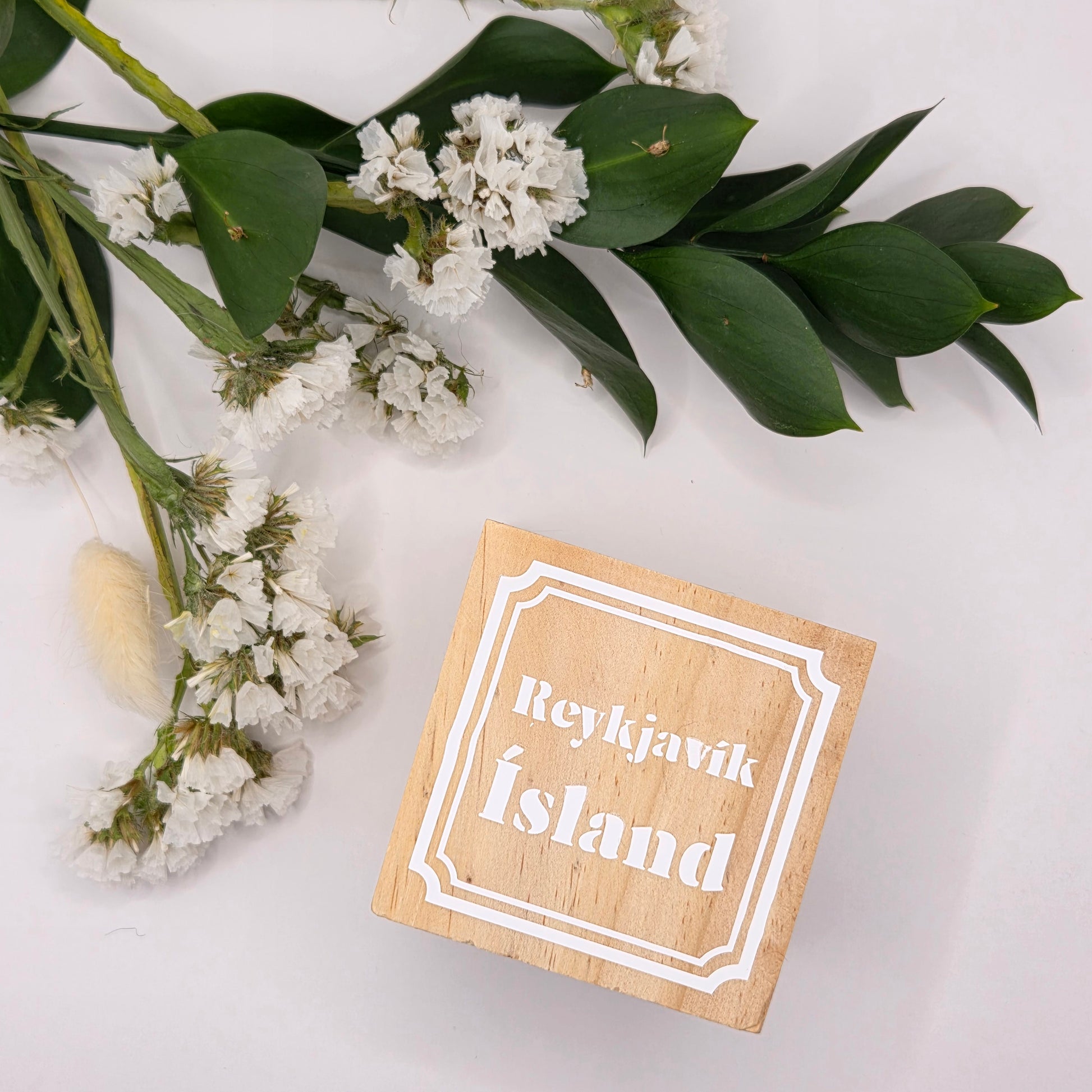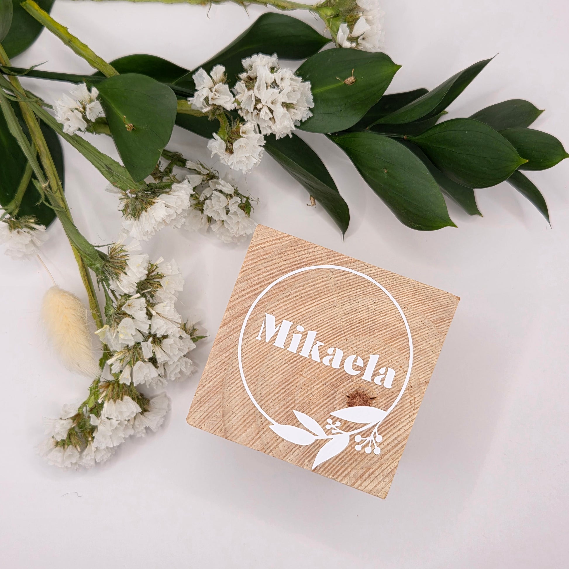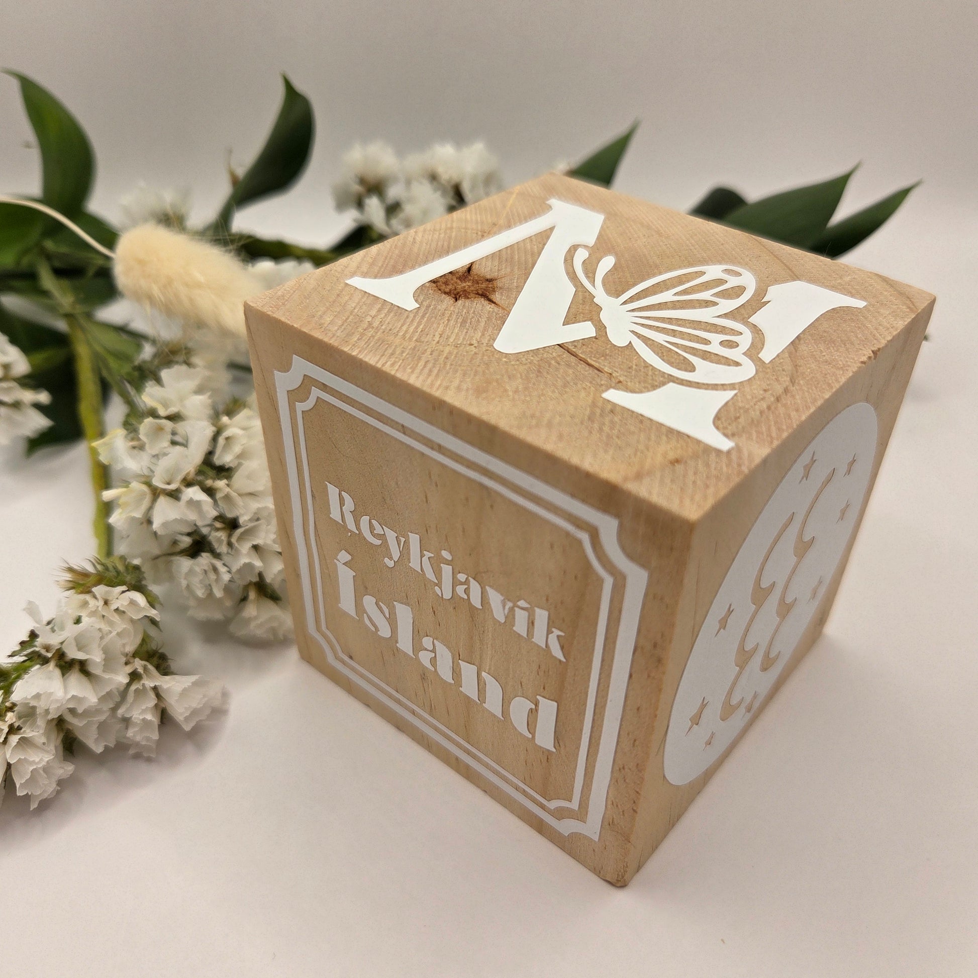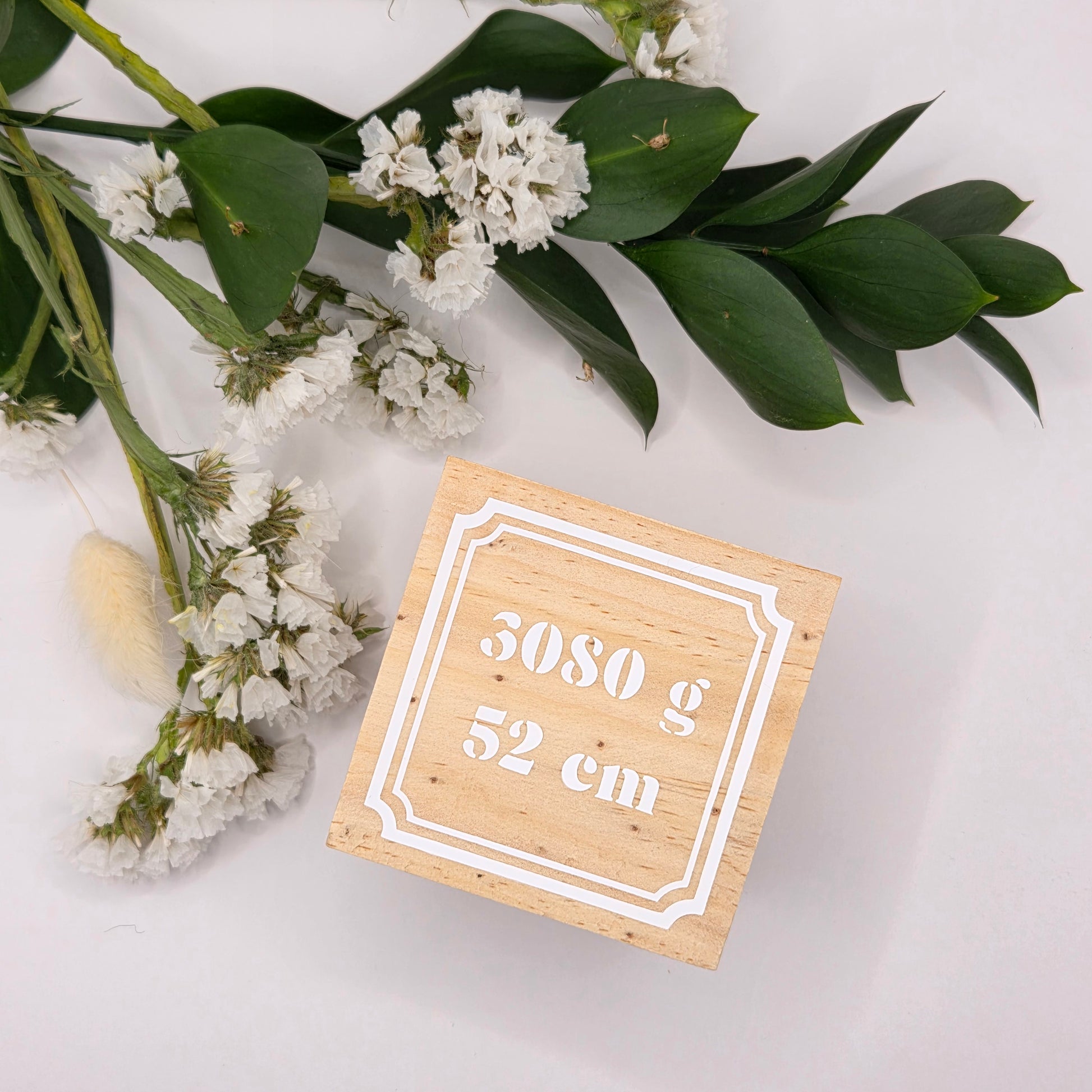 Fallegur viðarteningur með fæðingarupplýsingum barnsins.